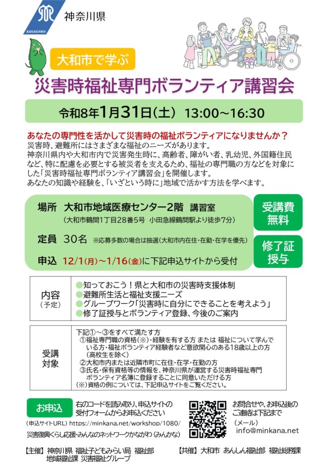 災害時、避難所にはさまざまな福祉のニーズがあります。神奈川県内や大和市内で災害発生時に、高齢者、障がい者、乳幼児、外国籍住民など、特に配慮を必要とする被災者を支えるため、福祉の専門職の方などを対象にした「災害時福祉専門ボランティア講習会」を開催します。